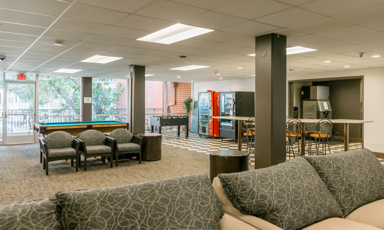 Built in 1966, Alpha is staffed by 10 RAs, under the supervision of Resident Director Tanner Clarke and a graduate assistant. Alpha is a traditional 'dorm-style' hall with community restrooms and a laundry room on each floor. There is a large main-floor lounge, a rooftop sundeck, a main kitchen and two microwave rooms. The lounges, prayer room and study room were recently renovated to create a warm, inviting community area for residents.